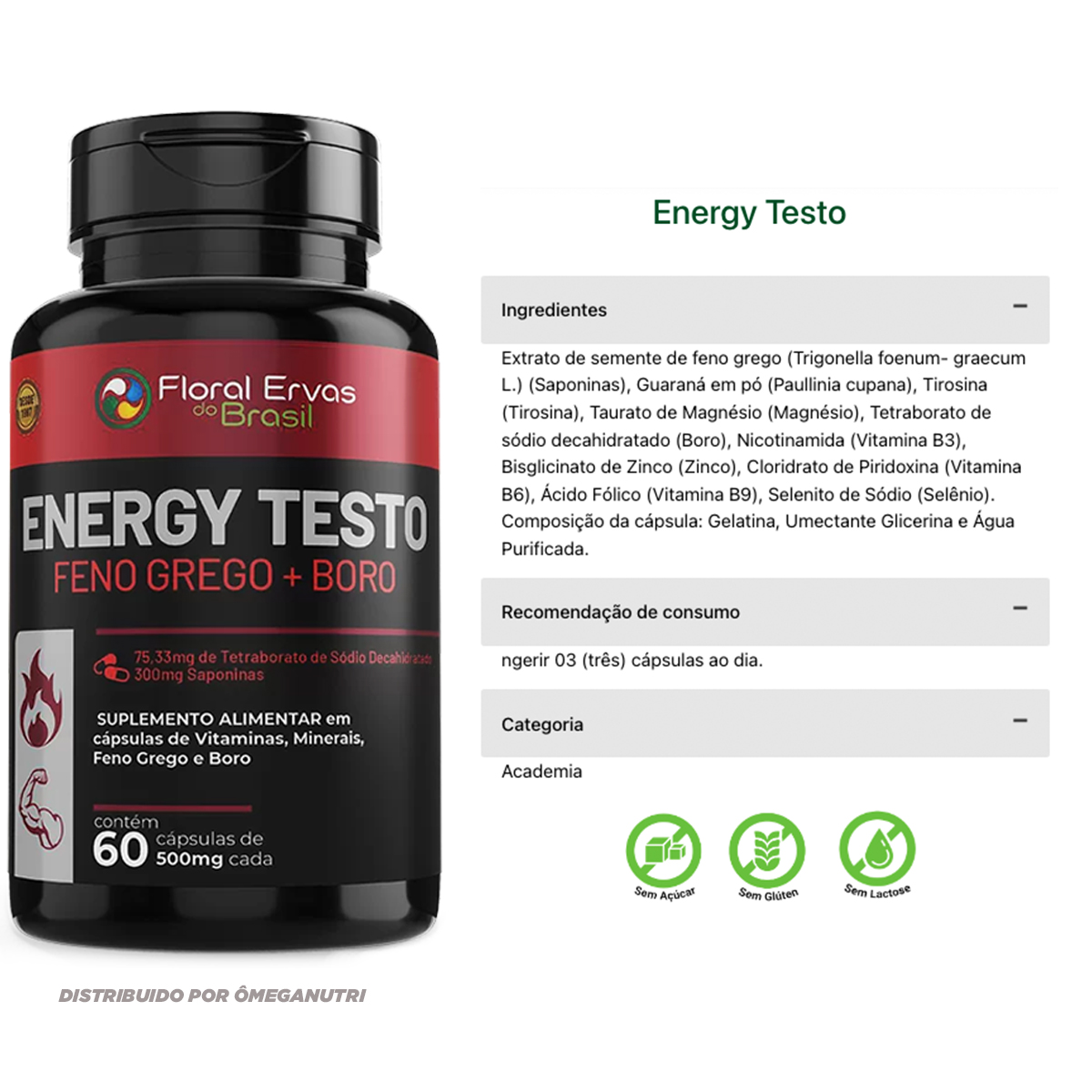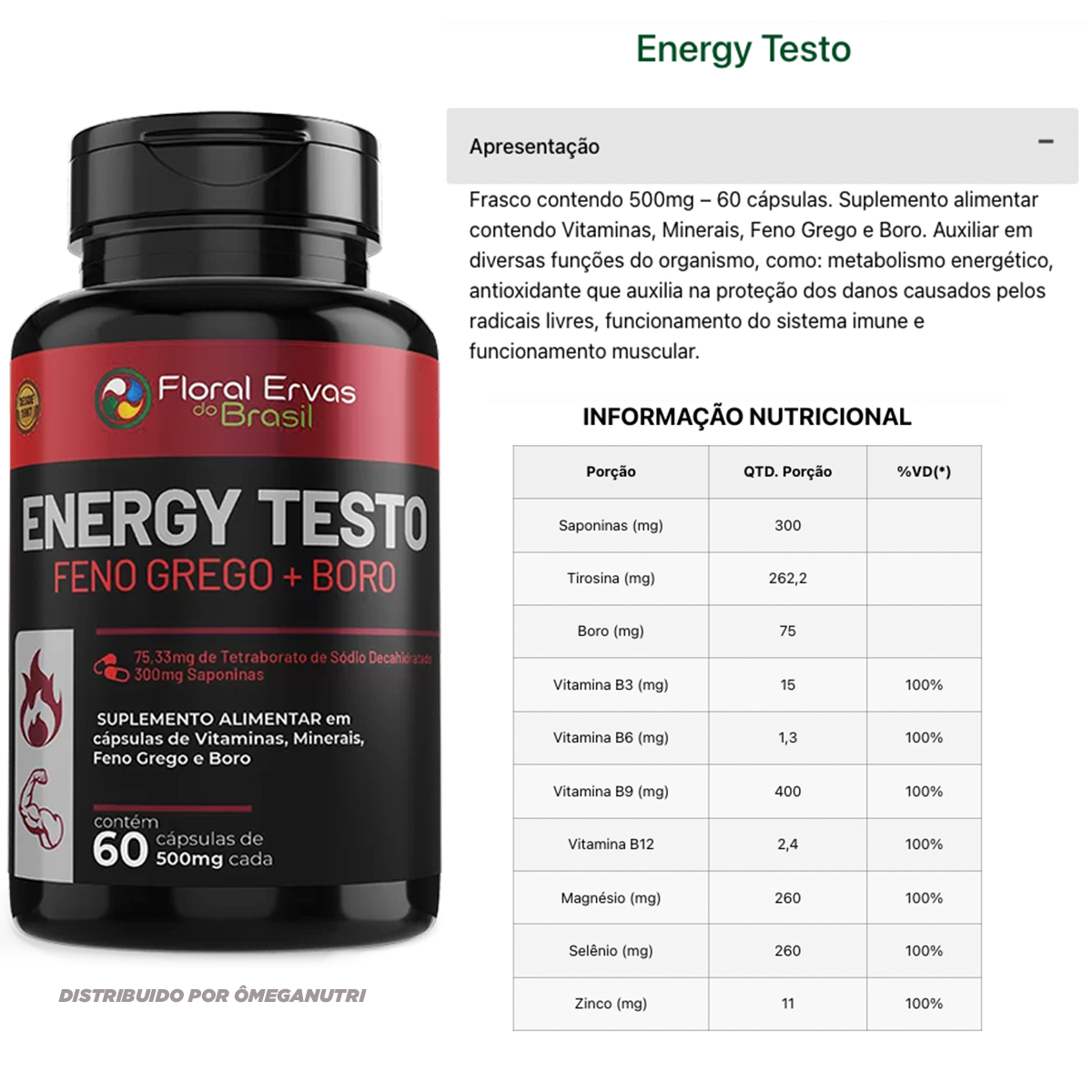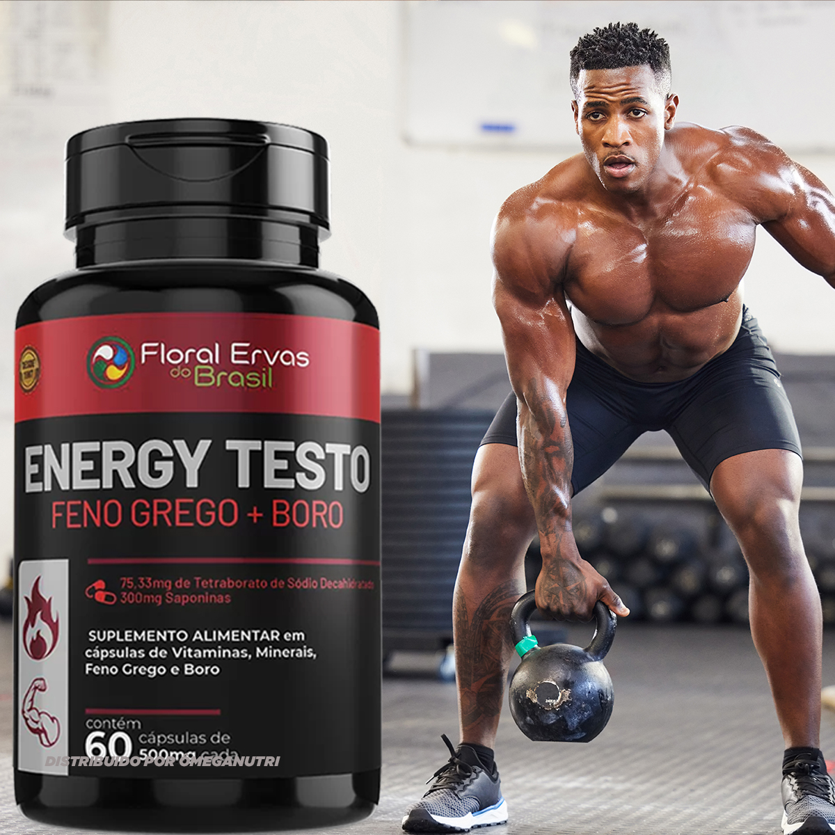 Energy Testo – Feno Grego + Boro – 60cp 500mg – Vitamina B3 B6 B9 B12 Magnésio Selênio Zinco Saponinas Tirosina